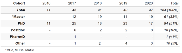 To determine a historical benchmark rate for sector of employment, data were derived from the 10,000 PhDs Project, School of Graduate Studies, University of Toronto (Reithmeier et al. 2018. Retrieved March 25, 2021 from www.sgs.utoronto.ca/about/Pages/10,000- PhDs-Project.aspx). From 2012 to 2015, there were 951 PhD graduates in life sciences (Faculties of Medicine, Dentistry, Pharmacy, Public Health). Their employment as of 2016: post-secondary, 47%; private (industry), 20%; public, 18%; charitable, 4%; individual, 1%; unknown, 10%. These rates were not compared to the rates for the Industry Team Case Study alumni due missing data on potential confounding factors.