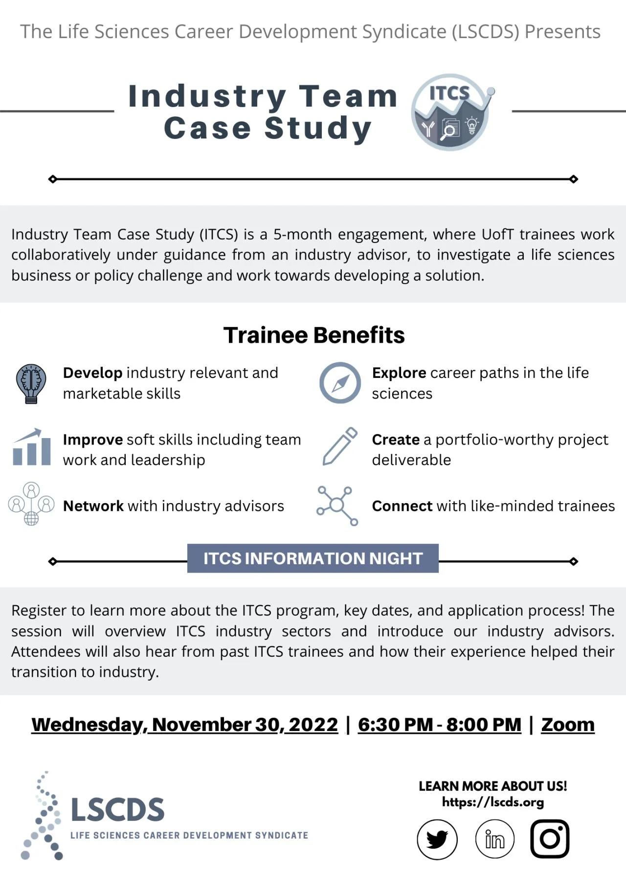 The Industry Team Case Study (ITCS) is a program designed for trainees to develop professional connections and gain practical, marketable experience relevant to roles within the healthcare and pharmaceutical sectors . Over the course of 5 months, invited trainees will work in teams to conceptualize, develop, and deliver an industry-related project under the direct mentorship of an industry advisor.