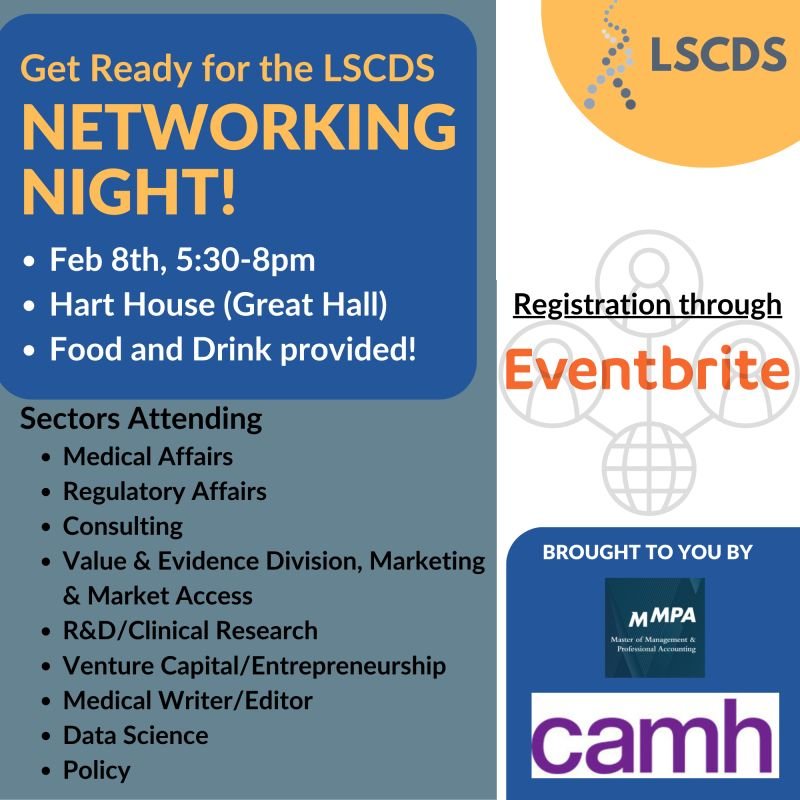 The LSCDS Networking Receptions is brought to you by the Master of Management & Professional Accounting and The Centre for Addiction and Mental Health. This event was organized by the LSCDS Networking team: Celene Titus, Jon Lacanlale, Sarah Cash, and Céline Cuinat Cuinat!